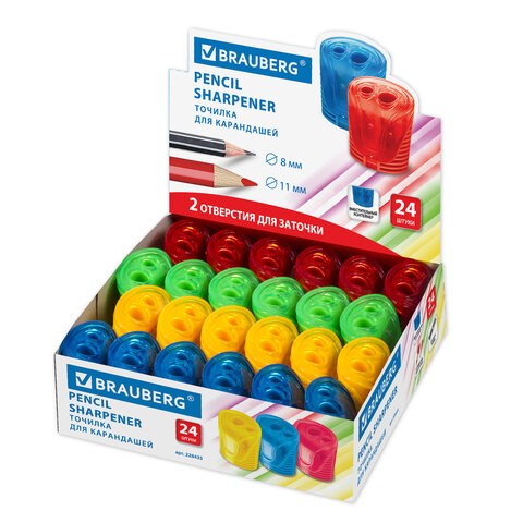 Точилка BRAUBERG "Cell Dual", 2 отверстия для чернографитных карандашей (в том числе утолщенных), с контейнером, корпус ассорти, 228435
