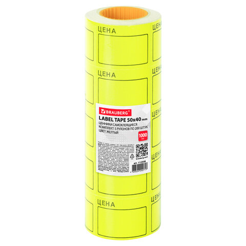 Ценник большой "Цена" 50х40 мм желтый, самоклеящийся, КОМПЛЕКТ 5 рулонов по 200 шт., BRAUBERG, 112358