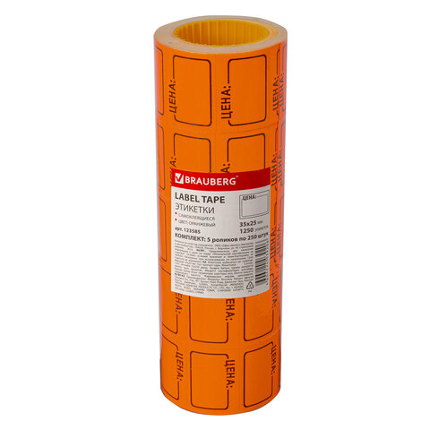 Ценник средний "Цена" 35х25 мм, оранжевый самоклеящийся, КОМПЛЕКТ 5 рулонов по 250 шт., BRAUBERG, 123585