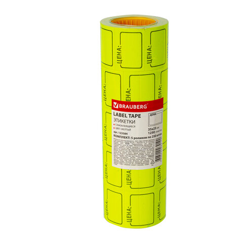 Ценник средний "Цена" 35х25 мм, желтый, самоклеящийся, КОМПЛЕКТ 5 рулонов по 250 шт., BRAUBERG, 123584