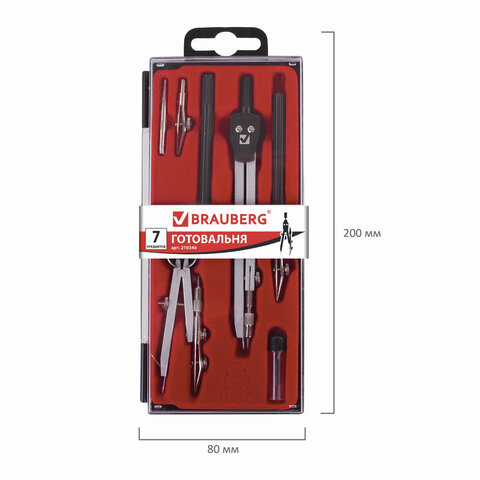 Готовальня BRAUBERG "Architect", 7 предметов: циркуль + кронциркуль с рейсфедором, рейсфедер + держатель, 2 вставки, грифель, 210346