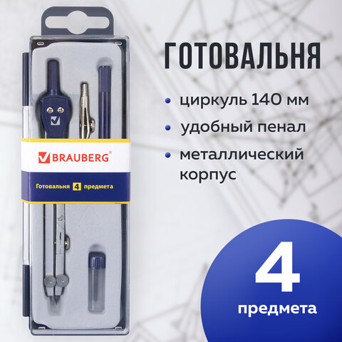 Готовальня BRAUBERG "Student Oxford", 4 предмета: циркуль 140 мм, рейсфедернная вставка + держатель, грифель, 210335