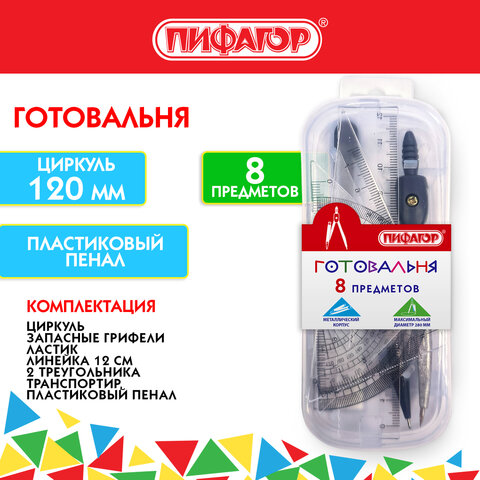 Готовальня ПИФАГОР 8 предметов: циркуль 120 мм, чертежные принадлежности, пластиковый пенал, 210860