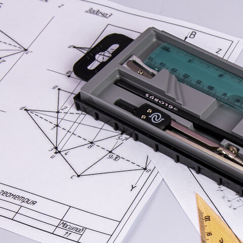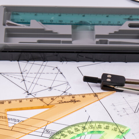 В наборе 9 предметов: циркуль чертежный, длина 125 мм, нержавеющий металл; пенал с запасным грифелем, карандаш чернографитный, точилка, ластик, треугольник 30°, треугольник 45°, транспортир, линейка 15 см.