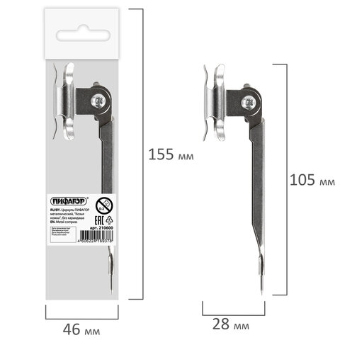 Циркуль ПИФАГОР металлический, "Козья ножка", без карандаша, 210600