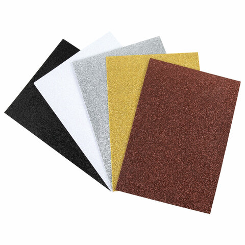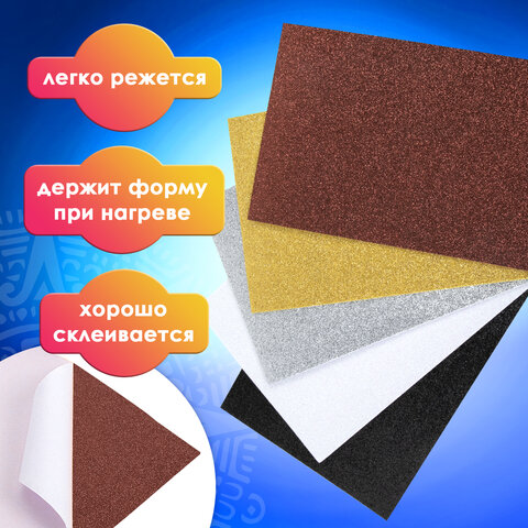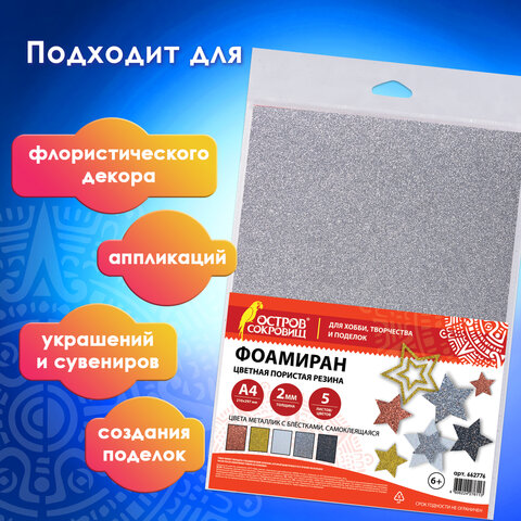Пористая резина/фоамиран А4, 2 мм, НАБОР, 5 листов, 5 цветов, металлик, блестки, самоклеящаяся, ОСТРОВ СОКРОВИЩ, 662776