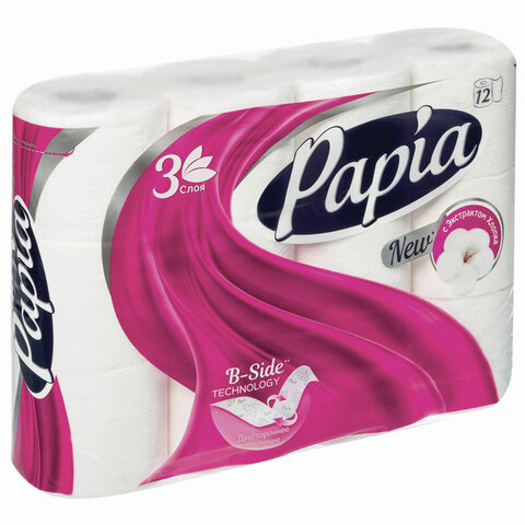 Бумага туалетная бытовая, спайка 12 шт., 3-слойная (12х16,8 м), PAPIA, белая, 5080722