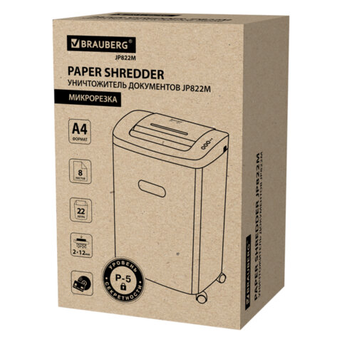 Уничтожитель (шредер) BRAUBERG JP822M, CD, 5 уровень секретности, 2х12 мм, 8 листов, корзина 22 литра, 532591