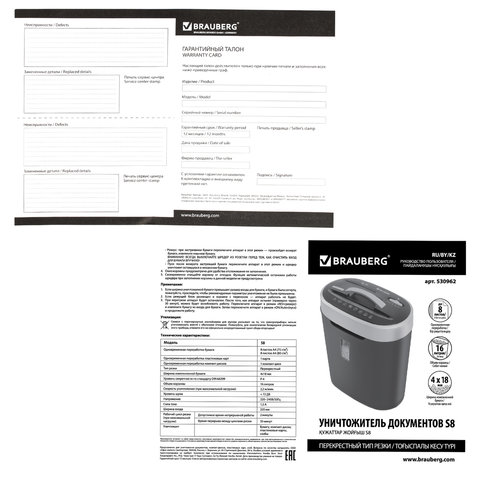 Уничтожитель документов (шредер) BRAUBERG S8 предназначен для уничтожения документов, компакт-дисков и пластиковых карт (банковских, дисконтных и прочих), потерявших актуальность.