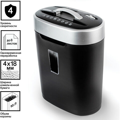 Уничтожитель (шредер) BRAUBERG S8, 4 уровень секретности, фрагменты 4х18 мм, 8 листов, корзина 16 литров, CD, 530962