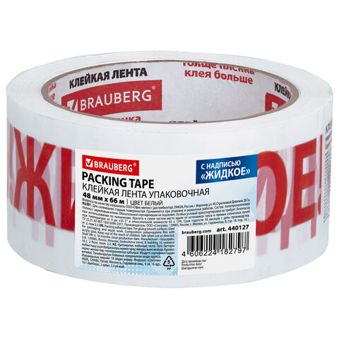Клейкая лента упаковочная, 48 мм х 66 м, белая, надпись "ЖИДКОЕ!!!", 45 микрон, BRAUBERG, 440127