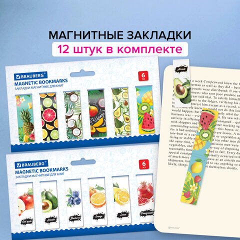 Закладки для книг МАГНИТНЫЕ, "FRUITS", набор 12 шт., 60x20 мм, BRAUBERG, 113173