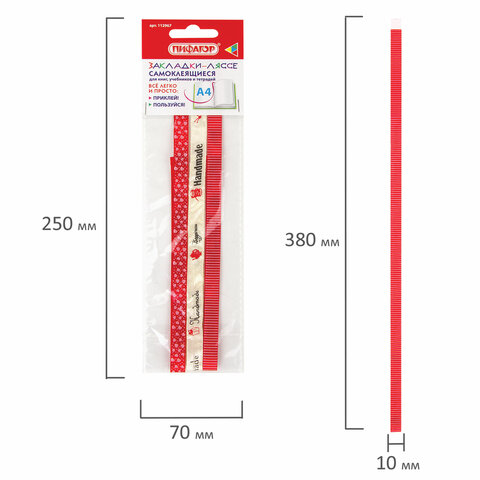 Закладки-ляссе фактурные для книг А4 (длина 38 см) "HANDMADE", клейкий край, 3 ленты, ПИФАГОР, 112967