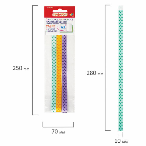 Закладки-ляссе фактурные для книг А5 (длина 28 см) "ФАНТАЗИЯ", клейкий край, 3 ленты, ПИФАГОР, 112971