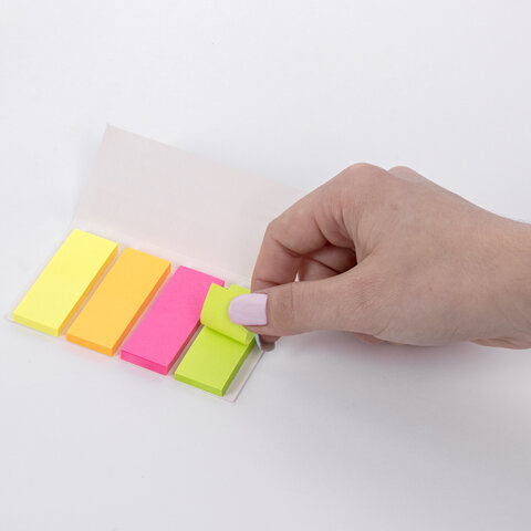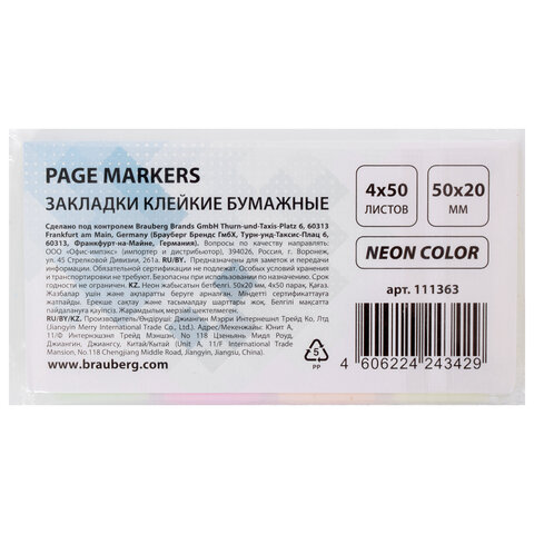 Закладки клейкие неоновые BRAUBERG бумажные, 50х20 мм, 200 штук (4 цвета х 50 листов), 111363