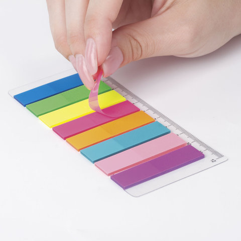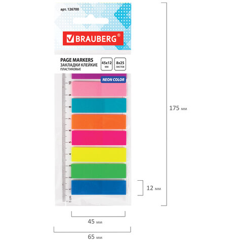 Закладки клейкие неоновые BRAUBERG, 45х12 мм, 200 штук (8 цветов х 25 листов), на пластиковой линейке 12 см, 126700