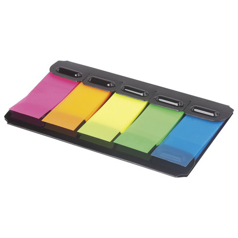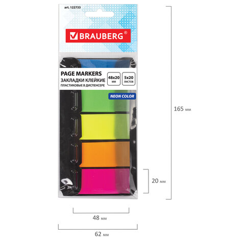 Закладки клейкие неоновые BRAUBERG, 48х20 мм, 100 штук (5 цветов х 20 листов), в пластиковом диспенсере, 122733
