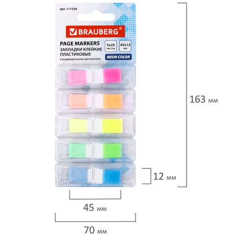 Закладки клейкие неоновые BRAUBERG, 45х12 мм, 125 штук (5 цветов х 25 листов), в пластиковых диспенсерах, 111356