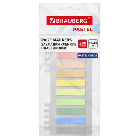 Закладки клейкие пастельные BRAUBERG PASTEL, пластиковые, 45х10 мм, 10 цветов х 20 листов, 115579