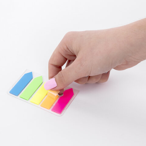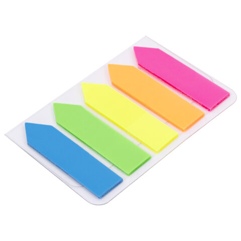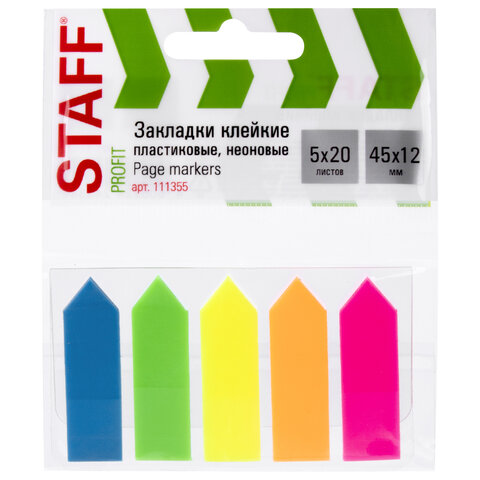 Закладки клейкие неоновые STAFF "СТРЕЛКИ", 45х12 мм, 100 штук (5 цветов х 20 листов), на пластиковом основании, 111355