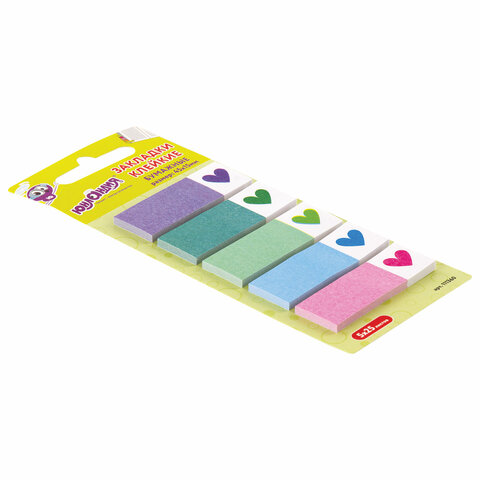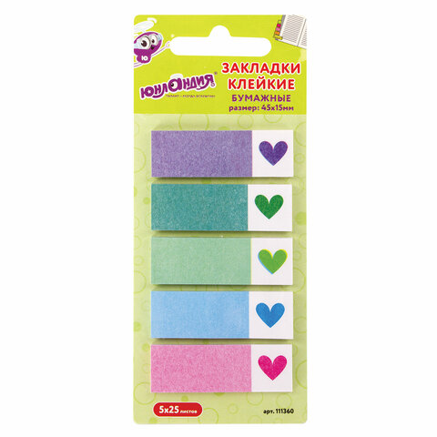 Закладки клейкие ЮНЛАНДИЯ бумажные "Сердечки", 45х15 мм, 125 штук (5 цветов х 25 листов), 111360