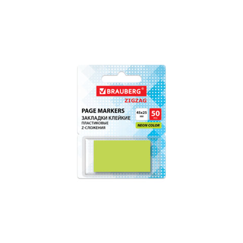 Закладки клейкие Z-сложения, неоновые зеленые, BRAUBERG ZigZag, 45х25 мм, 50 шт., в диспенсере, 116678