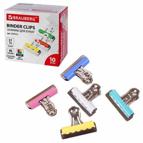 Зажимы-бульдоги для бумаг большие BRAUBERG, КОМПЛЕКТ 10 шт., 57 мм, на 90 листов, картонная коробка, 223514