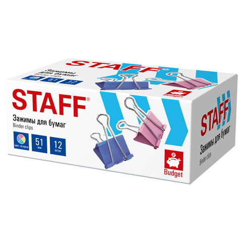 Зажимы для бумаг БОЛЬШИЕ STAFF ECO, КОМПЛЕКТ 12шт, 51мм, на 230 л, цветные, картонная коробка, 274041