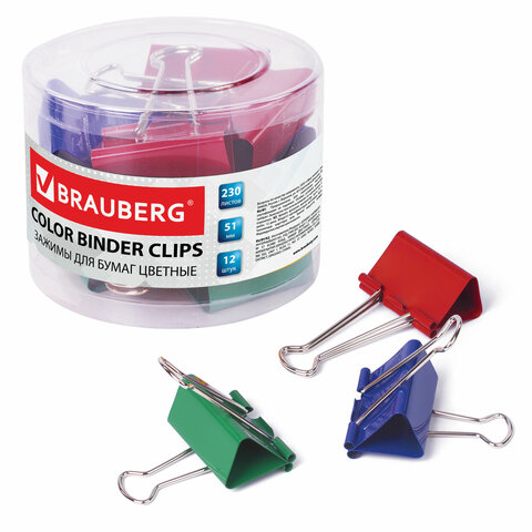 Зажимы для бумаг BRAUBERG, КОМПЛЕКТ 12 шт., 51 мм, на 230 листов, цветные, в пластиковом цилиндре, 221131