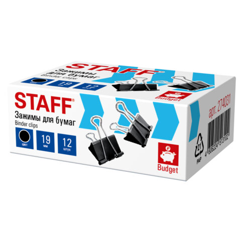 Зажимы для бумаг STAFF ECO, КОМПЛЕКТ 12 шт., 19 мм, на 60 листов, черные, картонная коробка, 274031