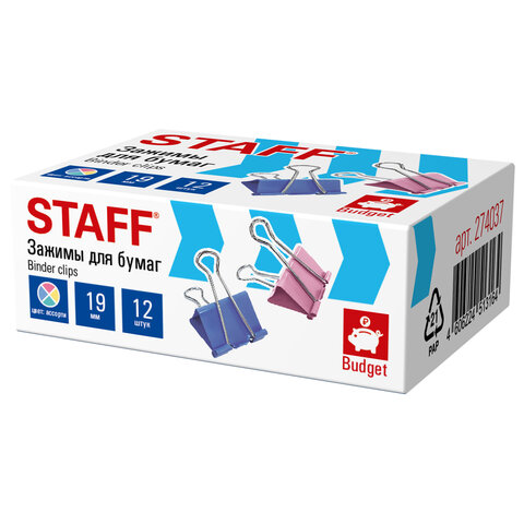 Зажимы для бумаг STAFF ECO, КОМПЛЕКТ 12 шт, 19 мм, на 60 листов, цветные, картонная коробка, 274037