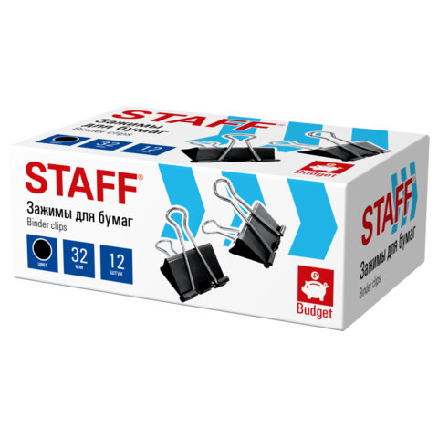 Зажимы для бумаг STAFF ECO, КОМПЛЕКТ 12 шт., 32 мм, на 140 листов, черные, картонная коробка, 274033