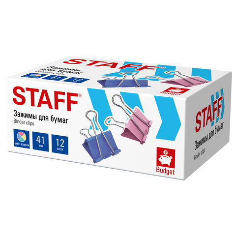 Зажимы для бумаг STAFF ECO, КОМПЛЕКТ 12 шт, 41 мм, на 200 листов, цветные, картонная коробка, 274040