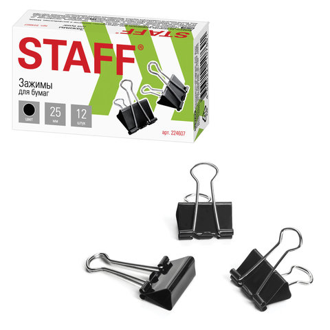 Зажимы для бумаг STAFF "EVERYDAY", КОМПЛЕКТ 12 шт., 25 мм, на 100 листов, черные, картонная коробка, 224607