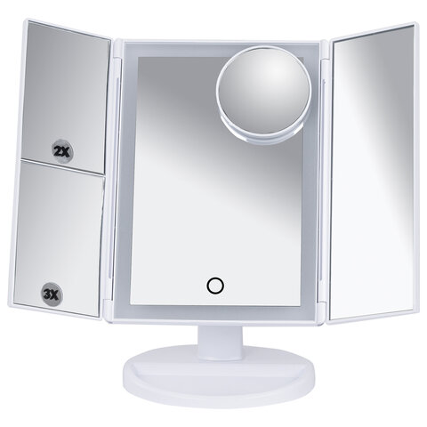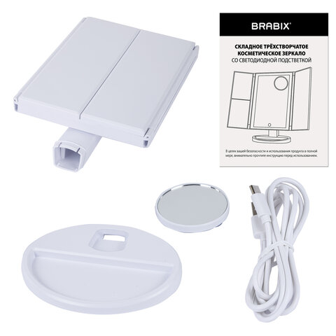 Зеркало настольное с LED-подсветкой для макияжа, размер 24х18 см, складное, увеличение х2, х3, х10, белое, BRABIX, 609337
