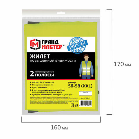 Жилет сигнальный, 2 светоотражающие полосы, ЛИМОННЫЙ, XXL (56-58), ГРАНДМАСТЕР, 610841