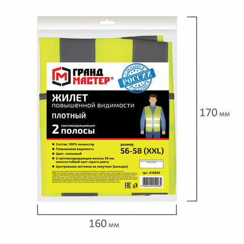 Жилет сигнальный ГОСТ, 2 светоотражающие полосы, ЛИМОННЫЙ, XXL (56-58), ПЛОТНЫЙ ГРАНДМАСТЕР, 610835