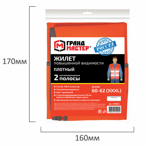 Жилет сигнальный ГОСТ, 2 светоотражающие полосы, ОРАНЖЕВЫЙ, XXXL (60-62), ПЛОТНЫЙ, ГРАНДМАСТЕР, 610833