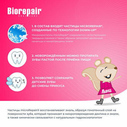 BIOREPAIR "Земляника" - зубная паста с экстрактом земляники для детей от 0 до 6 лет. Эмаль молочных зубов более тонкая и уязвимая, чем эмаль коренных.