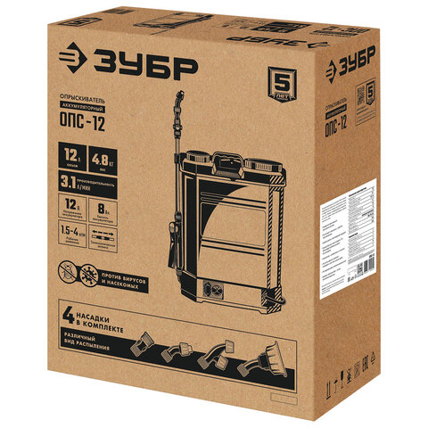 Опрыскиватель аккумуляторный ЗУБР ОПС-12, 12 л бак, 3,2 л/мин, 12 В, 8 А*ч, ОПС-12