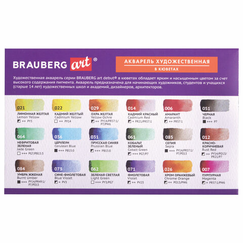 Художественная акварель профессионального качества в кюветах BRAUBERG ART DEBUT предназначена для живописи.