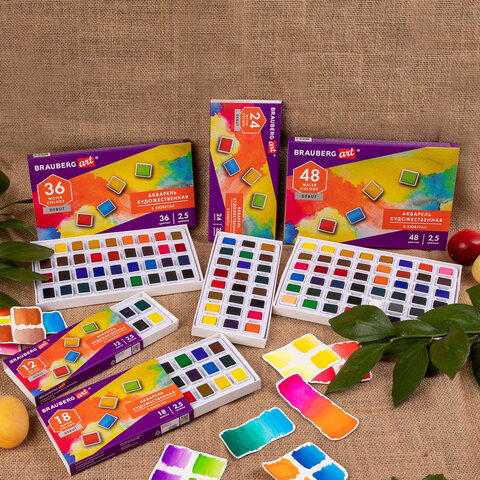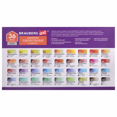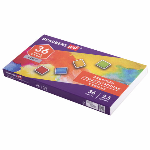 Акварель художественная в кюветах НАБОР 36 цветов по 2,5 г, BRAUBERG ART DEBUT, 191779