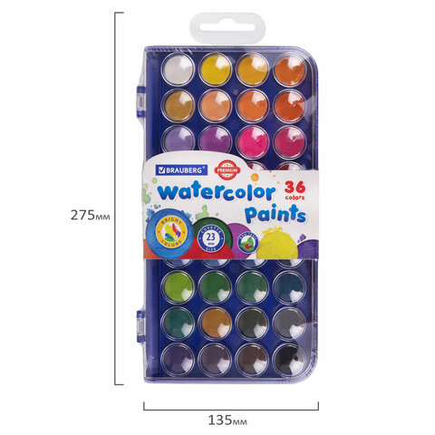 Краски акварельные BRAUBERG "PREMIUM" 36 цветов, круглые кюветы 23 мм, пенал, 191746