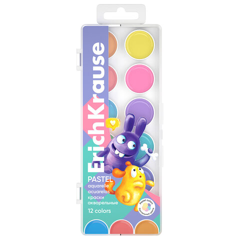 Краски акварельные ERICH KRAUSE "Jolly Friends Pastel", 12 цветов, пластиковый пенал, европодвес, 61370