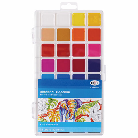 Краски акварельные ГАММА "Классическая", 32 цвета, медовая, пластиковая коробка, европодвес, 1009199
