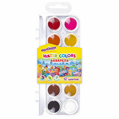Краски акварельные ЮНЛАНДИЯ "ДОМИКИ", 12 цветов, круглые кюветы 28 мм, пенал, 192630