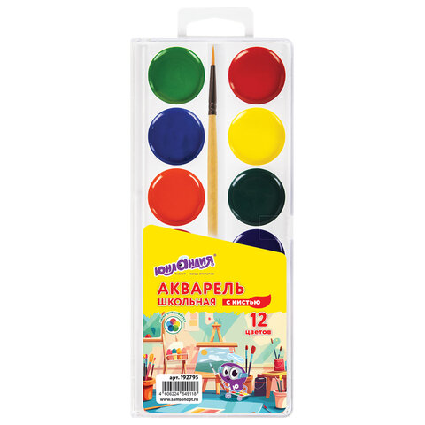 Краски акварельные ЮНЛАНДИЯ "ШКОЛЬНЫЕ", 12 цветов, медовые, КИСТЬ в комплекте, пластиковый пенал, 192795