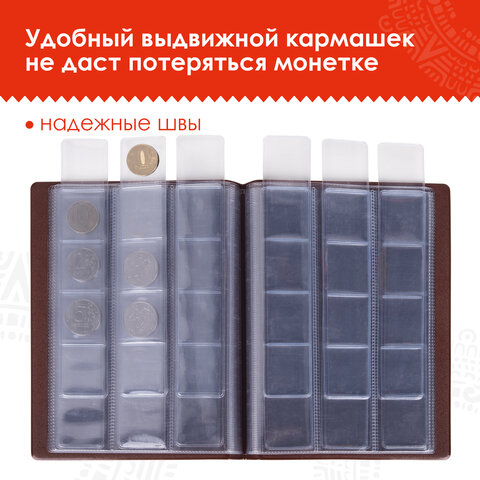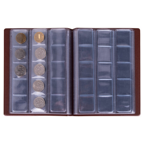 Альбом нумизмата для 90 монет (диаметр до 32 мм), 145х185 мм, коричневый, ОСТРОВ СОКРОВИЩ, 237959