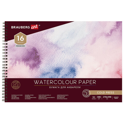 Альбом для акварели, бумага 300 г/м2, 270х390 мм, среднее зерно, 16 листов, гребень, BRAUBERG ART PREMIERE, 113213