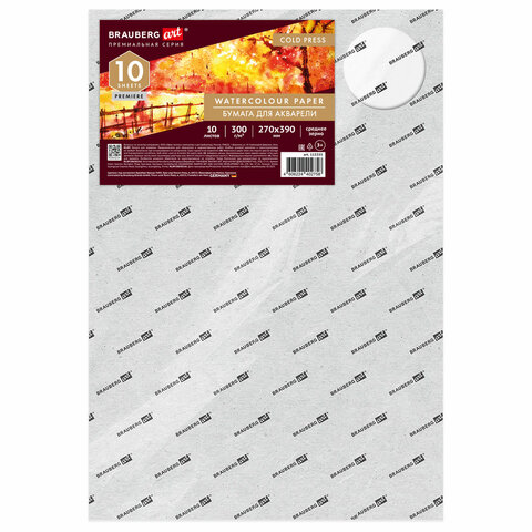 Бумага для акварели 300 г, 270x390 мм, среднее зерно, 10 листов, BRAUBERG ART PREMIERE, 115335